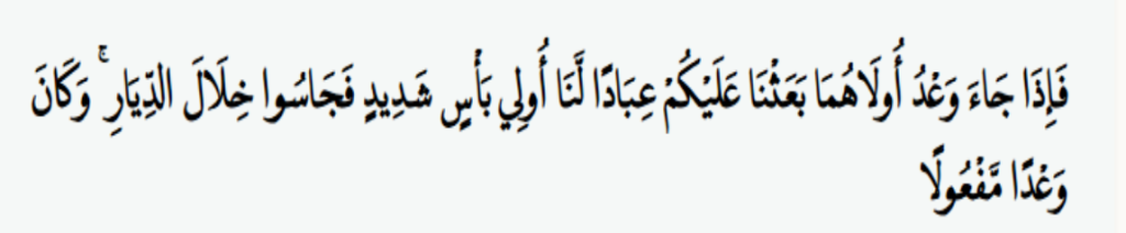 “Maka apabila datang saat hukuman bagi (kejahatan) yang pertama dari kedua (kejahatan) itu, Kami datangkan kepadamu hamba-hamba Kami yang perkasa, lalu mereka merajalela di kampung-kampung. Dan itulah ketetapan yang pasti terlaksana.”