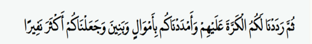 “Kemudian Kami berikan kepadamu giliran untuk mengalahkan mereka, Kami membantumu dengan harta kekayaan dan anak-anak dan Kami jadikan kamu kelompok yang lebih besar.”