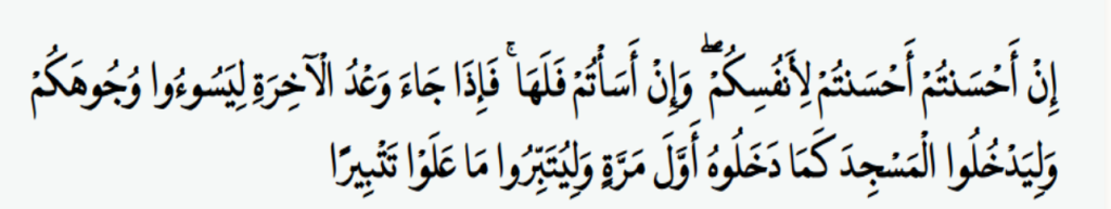 “Jika kamu berbuat baik (berarti) kamu berbuat baik untuk dirimu sendiri. Dan jika kamu berbuat jahat, maka (kerugian kejahatan) itu untuk dirimu sendiri. Apabila datang saat hukuman (kejahatan) yang kedua, (Kami bangkitkan musuhmu) untuk menyuramkan wajahmu lalu mereka masuk ke dalam masjid (Masjidil Aqsa), sebagaimana ketika mereka memasukinya pertama kali dan mereka membinasakan apa saja yang mereka kuasai.” Sumber https://mozaik.inilah.com/quran/al-isra’/7
